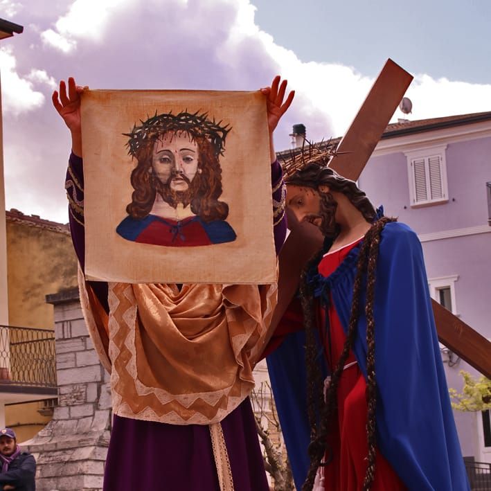 Uno dei momenti più toccanti è quello della Veronica, che asciuga il volto di Cristo e mostra al popolo il panno con l’immagine del Volto Santo, gesto simbolico che da sempre emoziona i fedeli presenti lungo il percorso.
